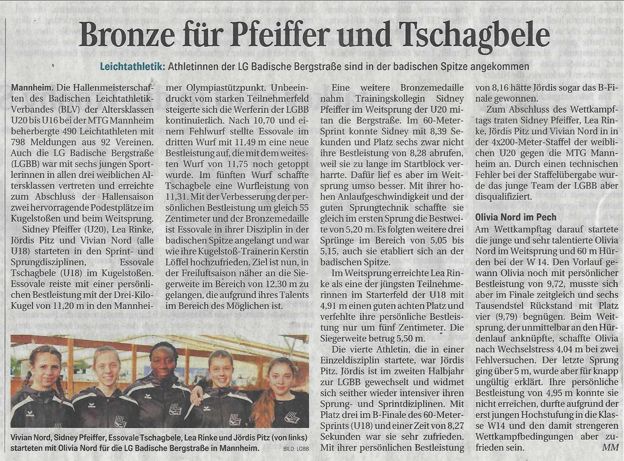 Bronze für Pfeiffer und Tschagbele Bronze für Pfeiffer und Tschagbele Athletinnen der LG Badische Bergstraße sind in der badischen Spitze angekommen Weiterlesen